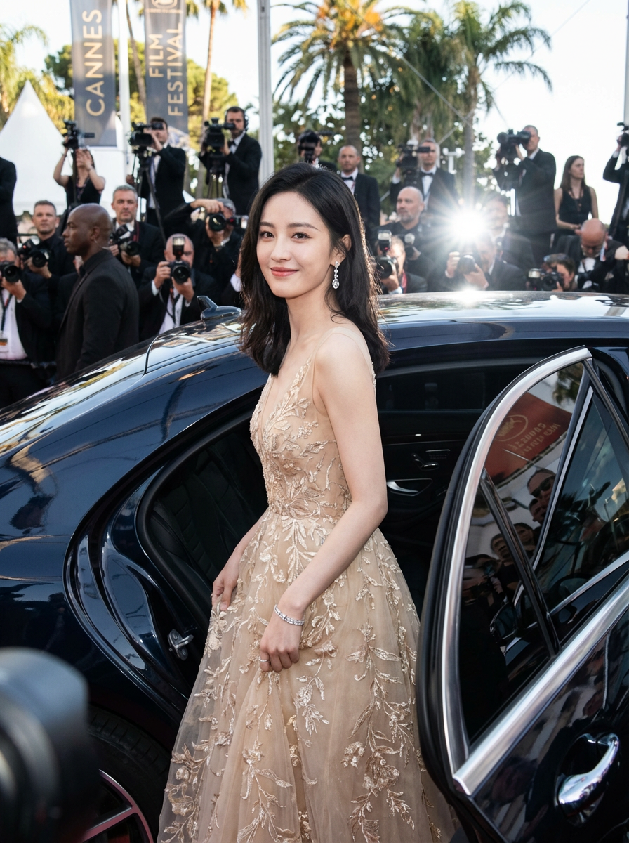 Full-body shot of a famous actor at the Cannes Film Festival, elegantly stepping onto the red carpet. The model is dressed in a flowing couture dress with diamond accessories . The scene is filled with flashing cameras and luxurious event decorations.