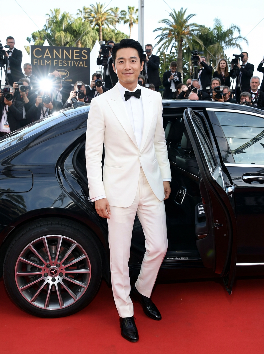 Full-body shot of a famous actor at the Cannes Film Festival, elegantly stepping onto the red carpet. The model is dressed in a tailored white tuxedo with sleek black dress shoes. The scene is filled with flashing cameras and luxurious event decorations.