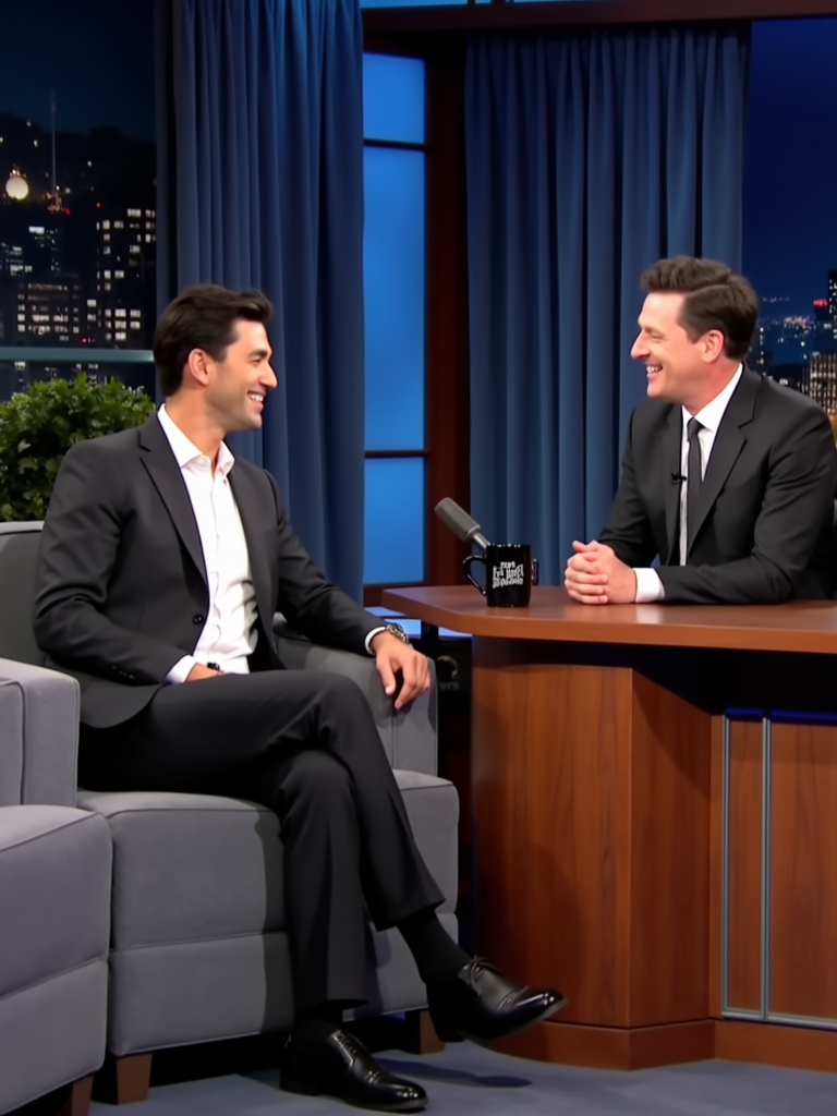 Full-body shot of a famous model sitting on the guest couch at a late-night talk show. The model is dressed in a stylish dark suit with a crisp white shirt. The host sits behind a wooden desk, smiling and engaged in conversation. The background features the signature blue curtains, the late night show logo, and the glowing New York City skyline.
