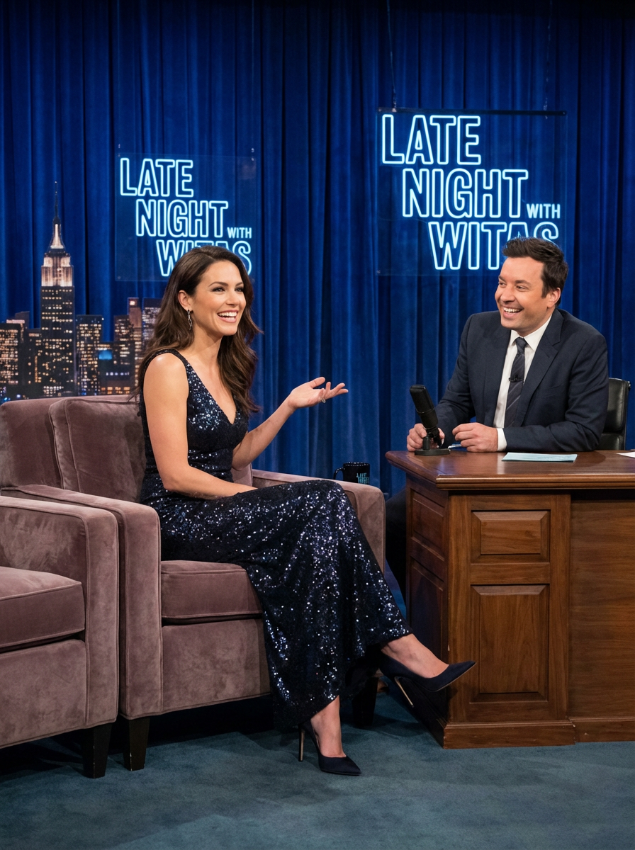 Full-body shot of a famous model sitting on the guest couch at a late-night talk show. The model is dressed in a glamorous designer evening gown with elegant heels . The host sits behind a wooden desk, smiling and engaged in conversation. The background features the signature blue curtains, the late night show logo, and the glowing New York City skyline.