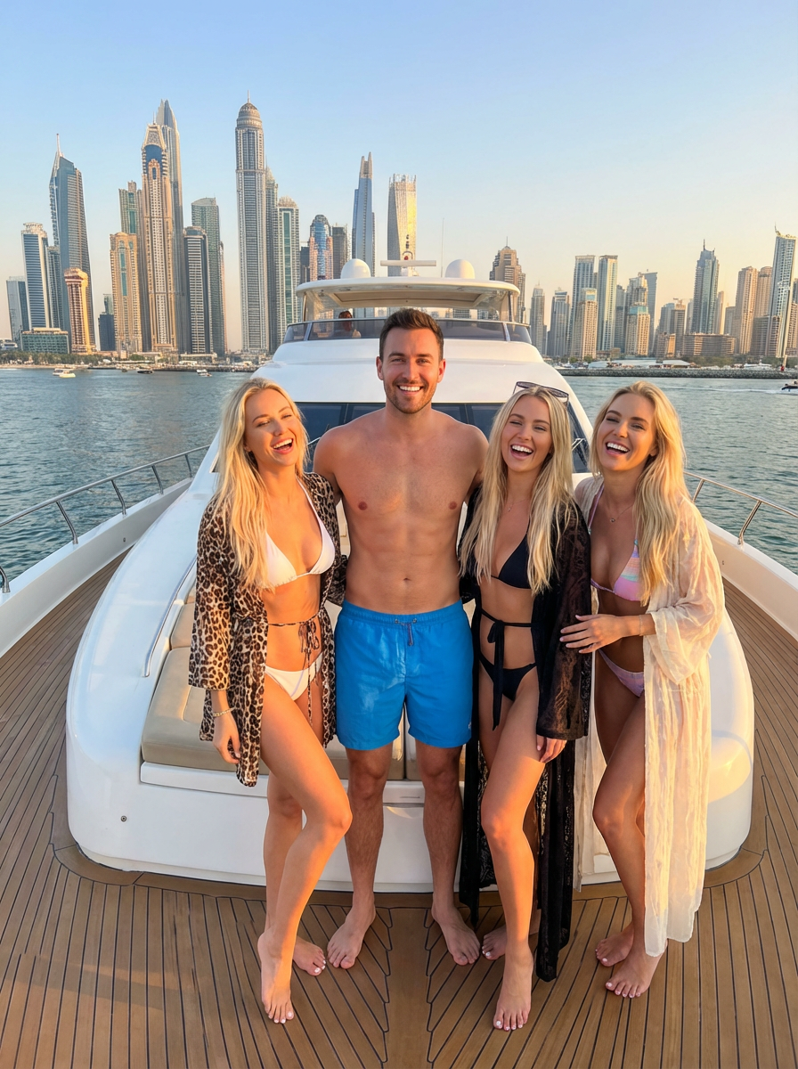 Full-body shot of a model in blue swim shorts posing confidently on a luxury yacht, set against a stunning modern city skyline with tall skyscrapers. The model is surrounded by beautiful blonde women in bikini.