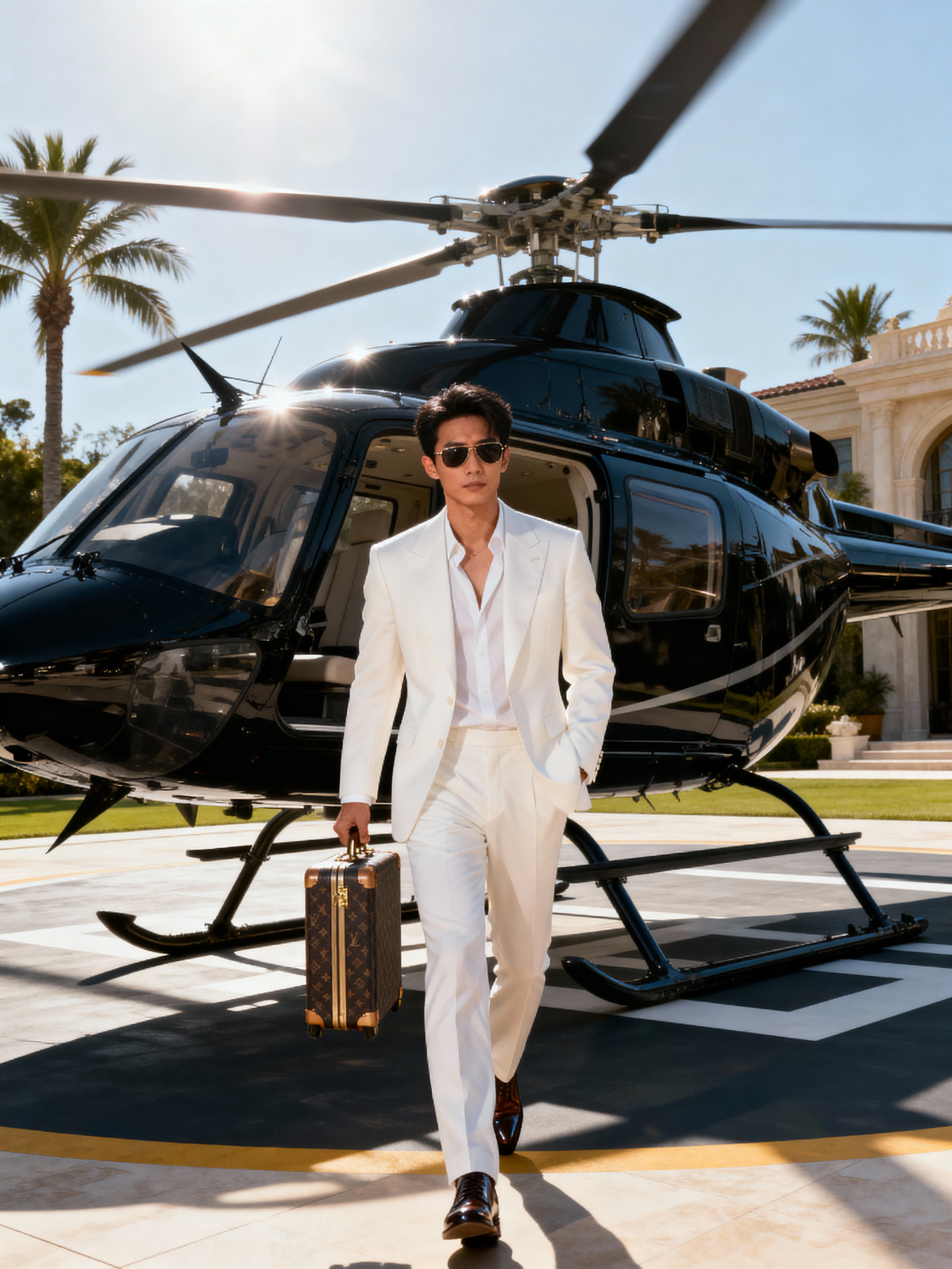 Full-body shot of a model stepping confidently away from a sleek, black helicopter on a luxurious helipad. The model is wearing a tailored white suit with sunglasses, polished dress shoes and a stylish suitcase. The backdrop features a clear sky, palm trees, and a luxurious architectural setting, emphasizing a high-end, elite lifestyle. Dramatic sunlight enhances the glamorous scene