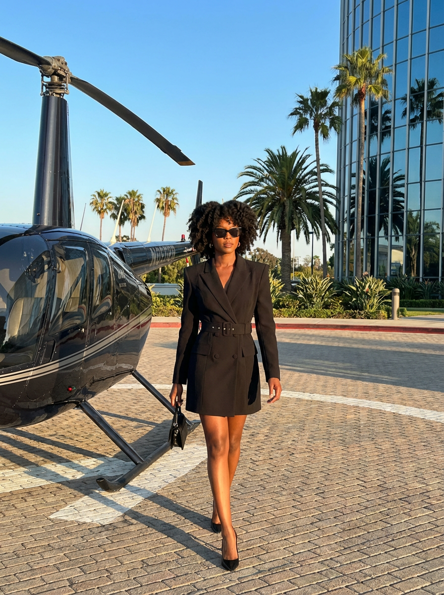 Full-body shot of a model stepping confidently away from a sleek, black helicopter on a luxurious helipad. The model is wearing black belted mini dress with a structured design, featuring a fitted bodice and flared skirt . The backdrop features a clear sky, palm trees, and a luxurious architectural setting, emphasizing a high-end, elite lifestyle. Dramatic sunlight enhances the glamorous scene