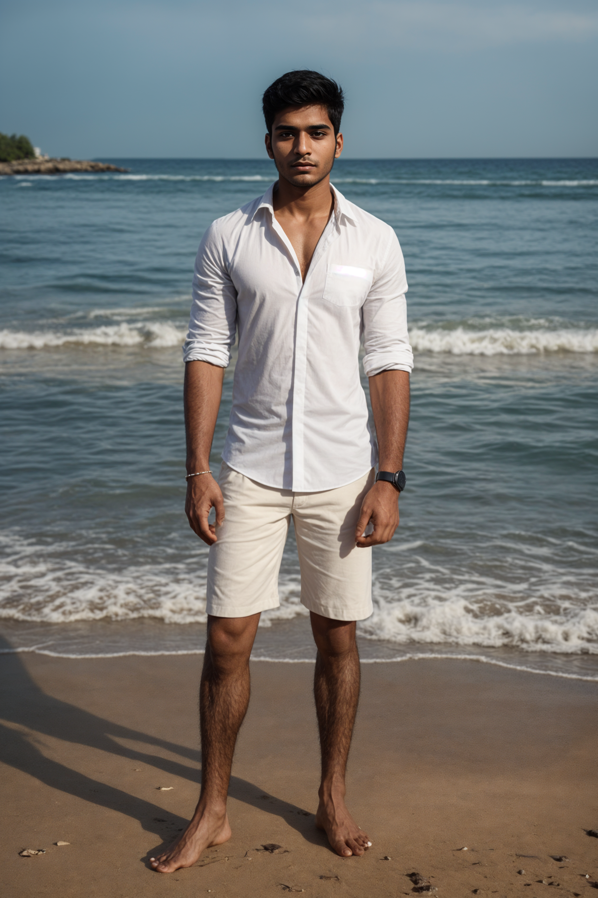 (full-body shot) of model in a smart casual beach attire, posed against a vibrant beach setting