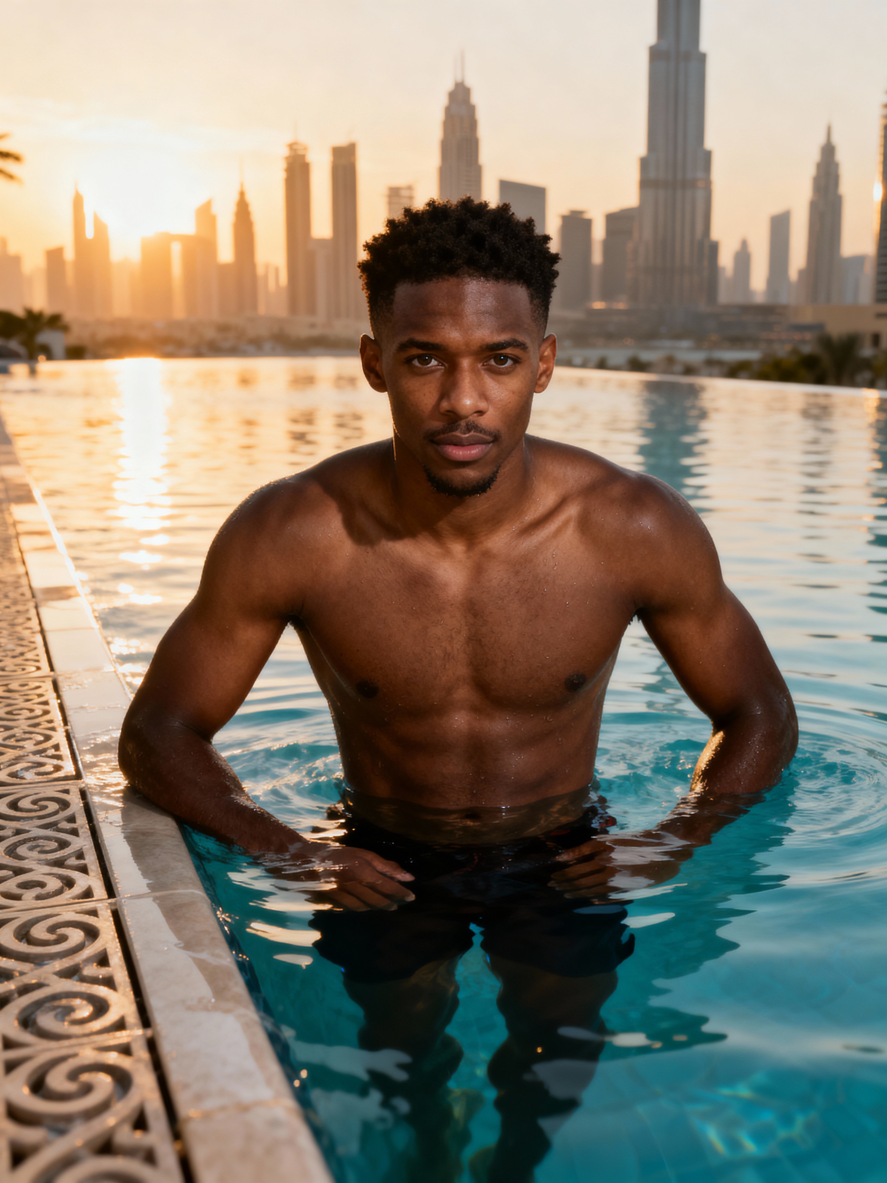 Full-body shot of model in infinity pool overlooking the skyline of Dubai at golden hour sunset. Model looks into the camera. upper body is outside the water.