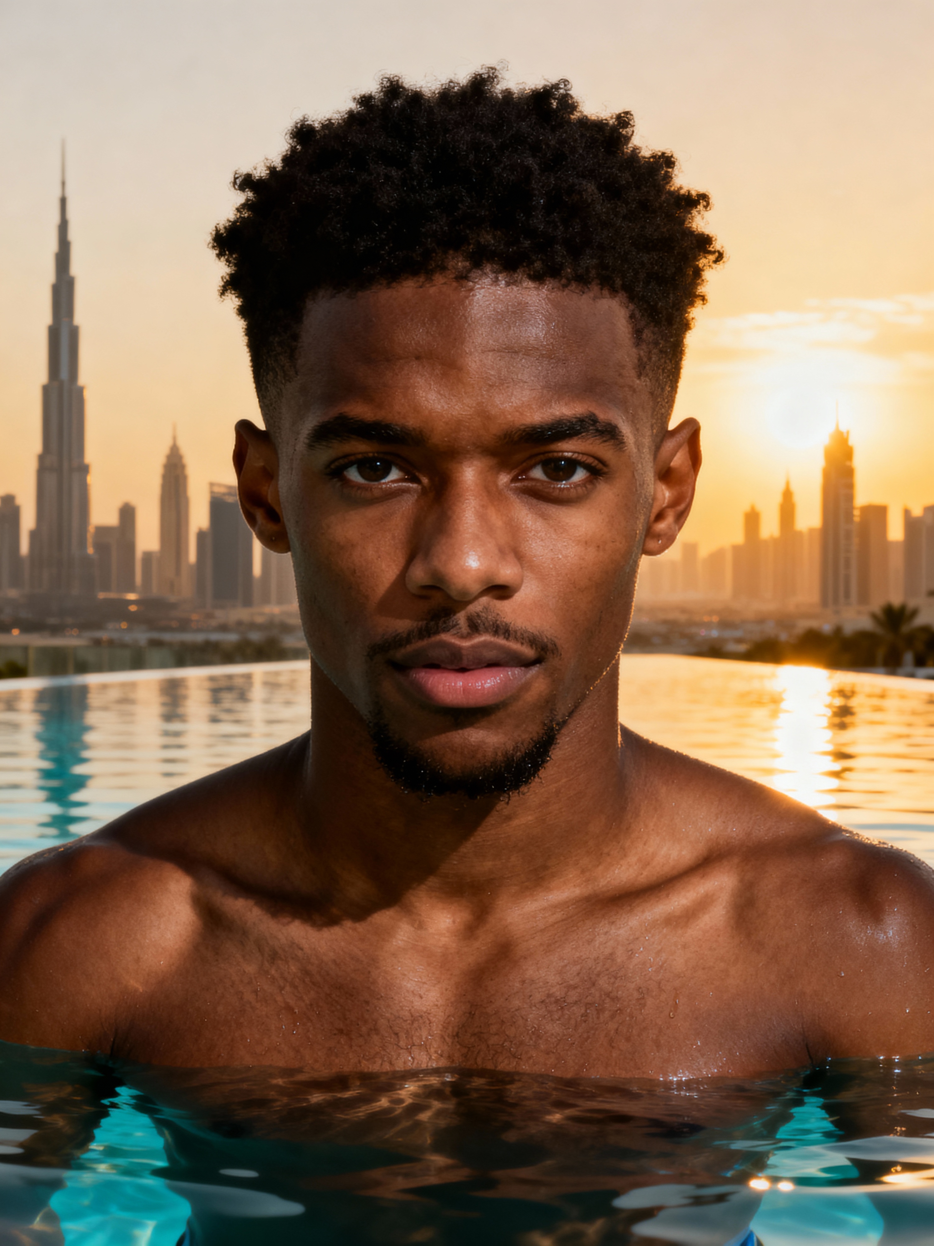 Full-body shot of model in infinity pool overlooking the skyline of Dubai at golden hour sunset. Model looks into the camera. upper body is outside the water.
