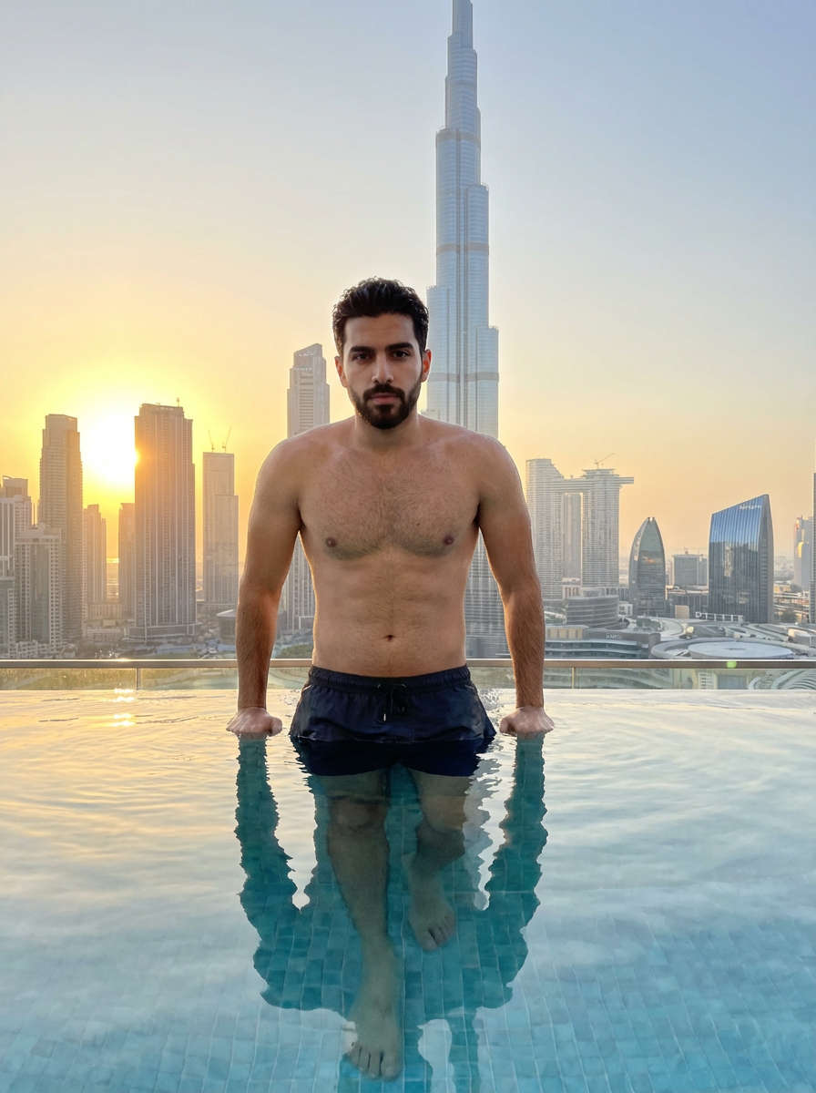 Full-body shot of model in infinity pool overlooking the skyline of Dubai at golden hour sunset. Model looks into the camera. upper body is outside the water.