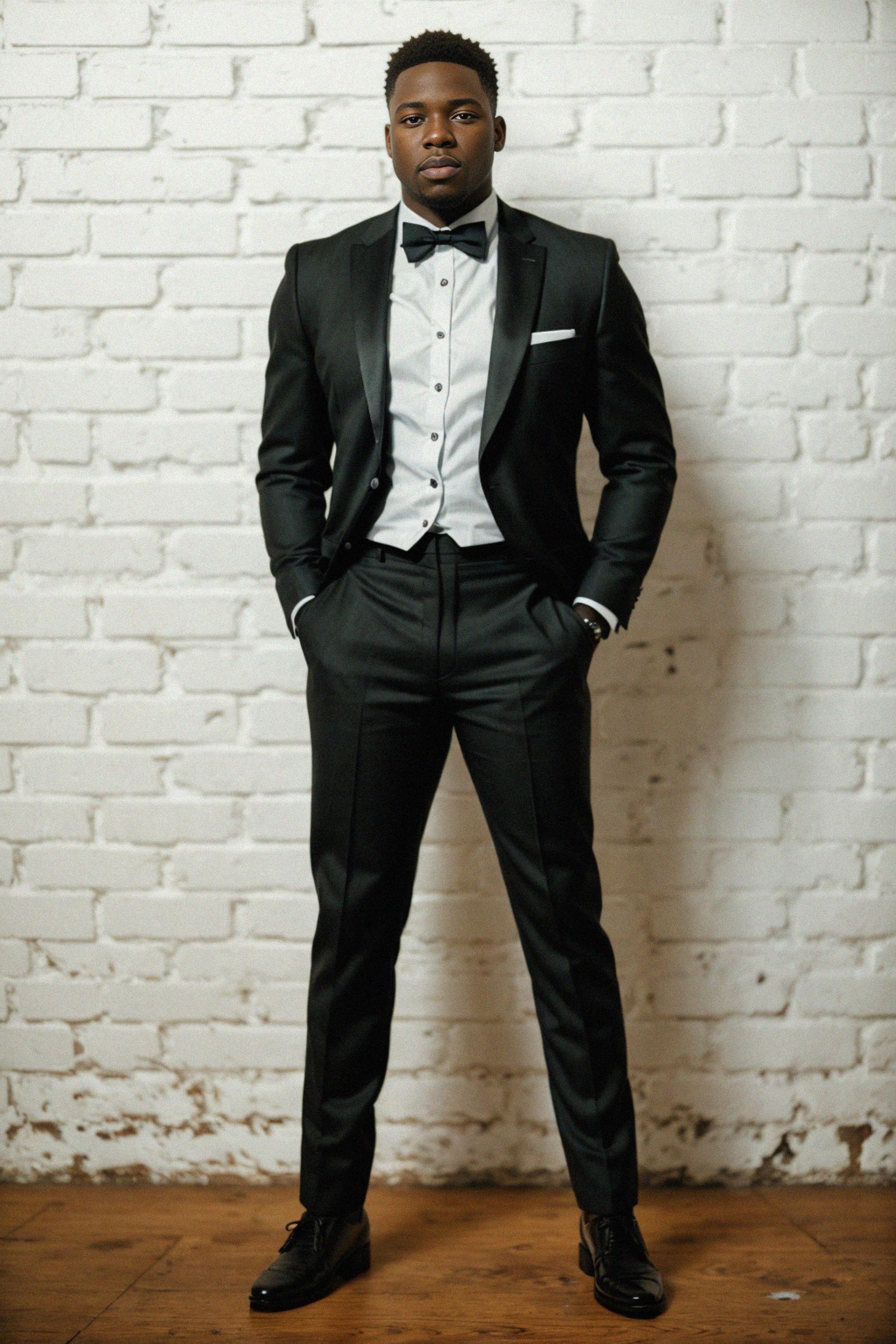 (full-body shot) of model in sharp, tailored suit against a classic brick wall background