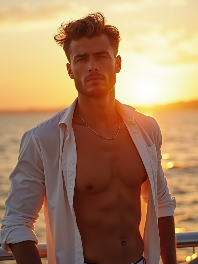 Full-body shot of model posing confidently, on a private yacht with the sunset in the background. Golden hour lighting.