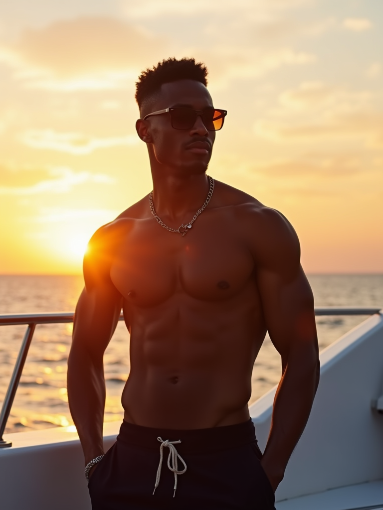 Full-body shot of model posing confidently, on a private yacht with the sunset in the background. Golden hour lighting.