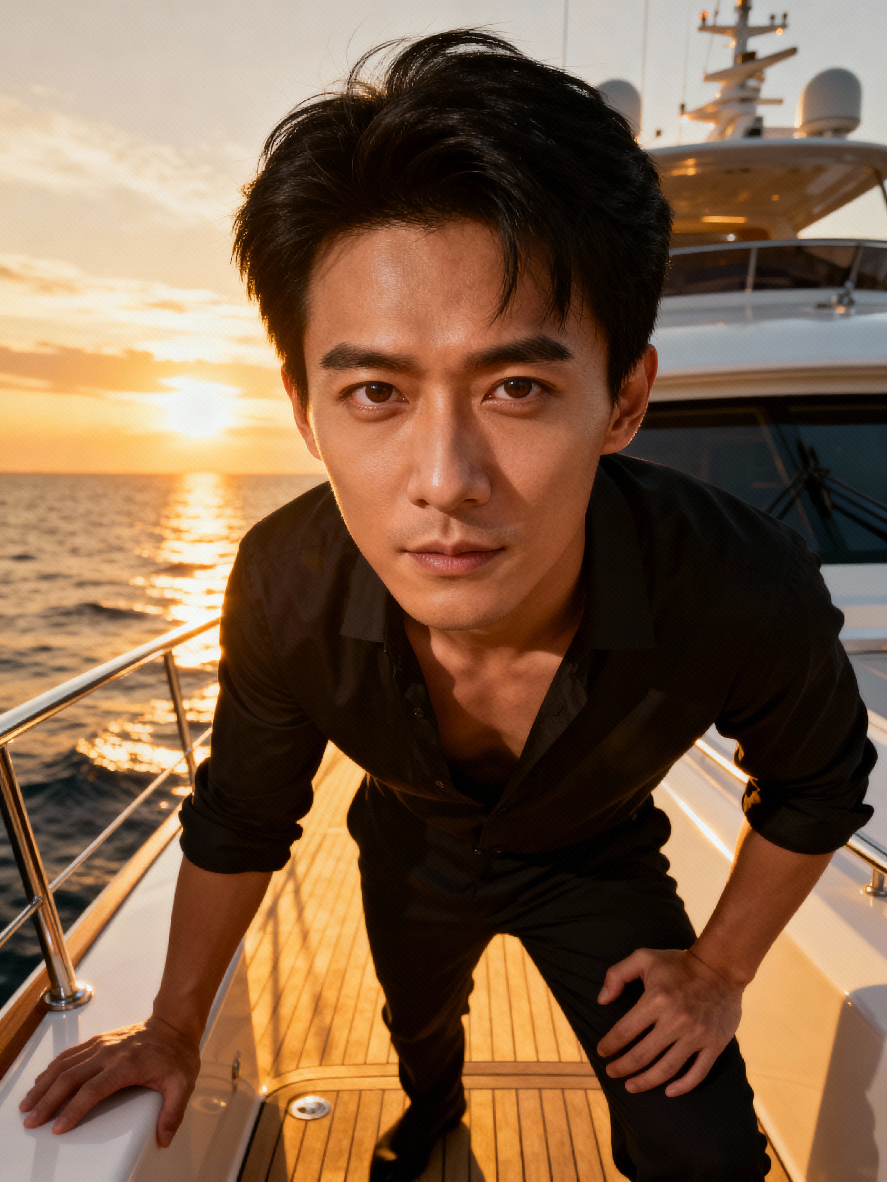 Full-body shot of model posing confidently, on a private yacht with the sunset in the background. Golden hour lighting.