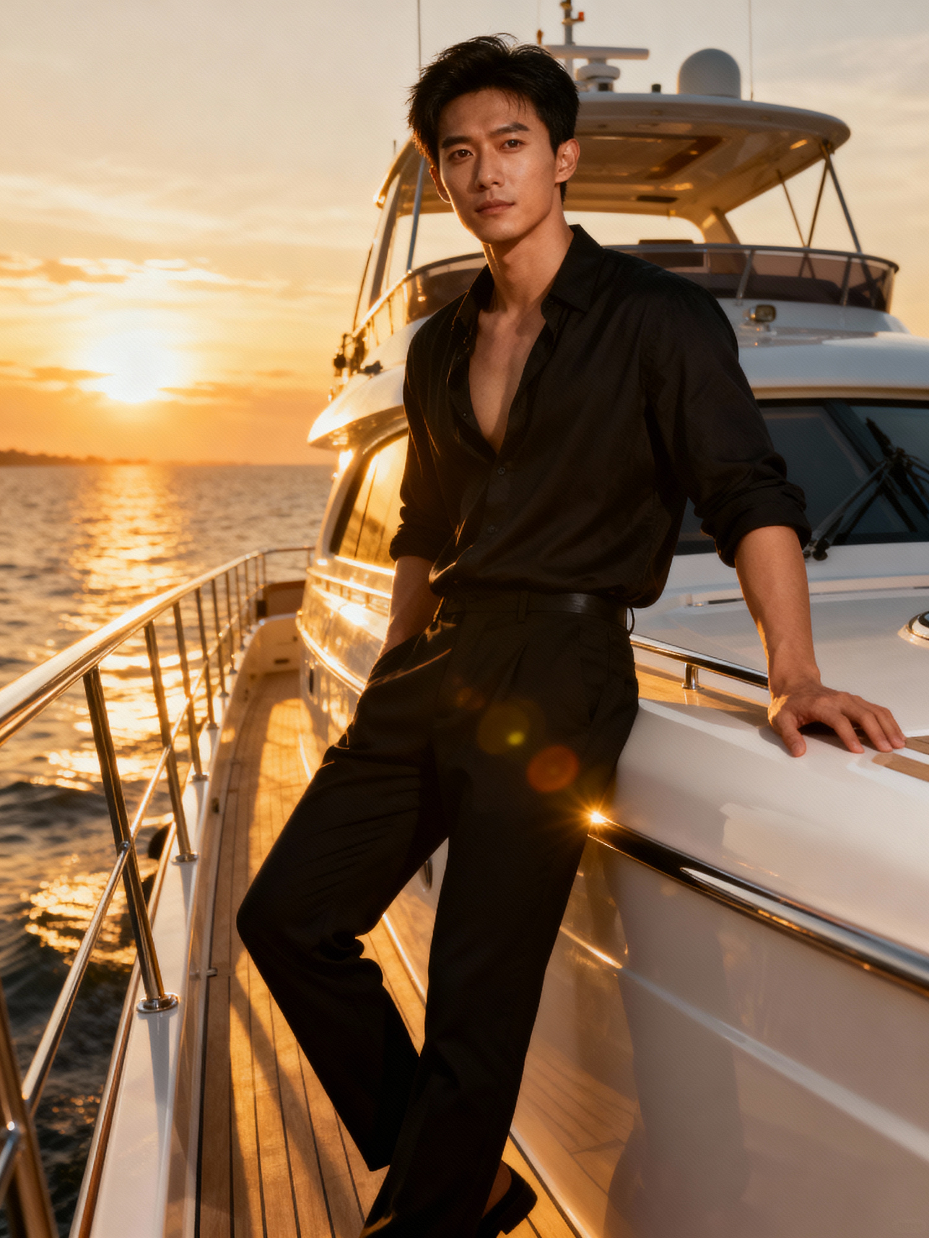 Full-body shot of model posing confidently, on a private yacht with the sunset in the background. Golden hour lighting.