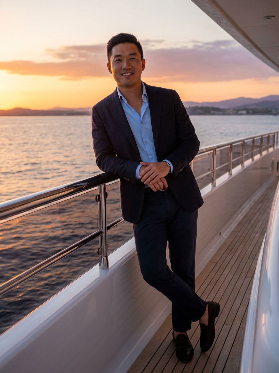 Full-body shot of model posing confidently, on a private yacht with the sunset in the background. Golden hour lighting.