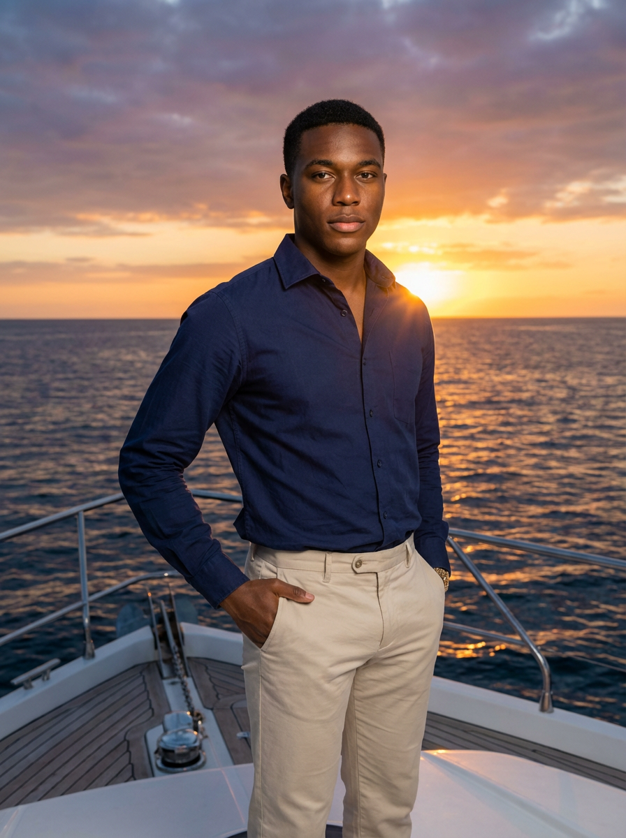 Full-body shot of model posing confidently, on a private yacht with the sunset in the background. Golden hour lighting.