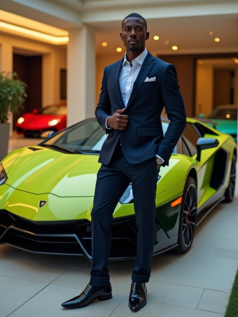 Full-body shot of of model standing next to a luxury car, wearing a sophisticated navy blazer and tailored trousers. The background features a luxury design villa in Dubai with green, yellow and red sports cars. Vibrant lighting.