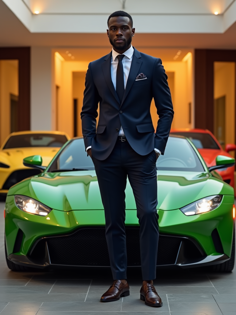 Full-body shot of of model standing next to a luxury car, wearing a sophisticated navy blazer and tailored trousers. The background features a luxury design villa in Dubai with green, yellow and red sports cars. Vibrant lighting.