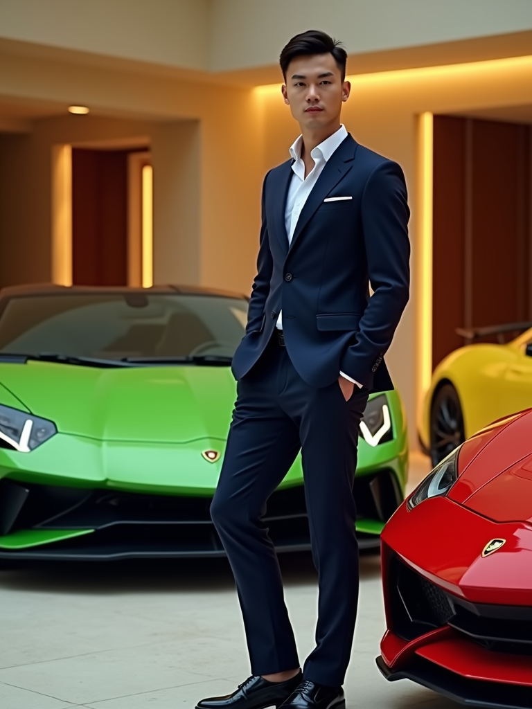 Full-body shot of of model standing next to a luxury car, wearing a sophisticated navy blazer and tailored trousers. The background features a luxury design villa in Dubai with green, yellow and red sports cars. Vibrant lighting.
