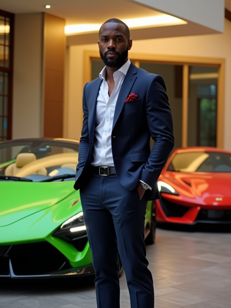 Full-body shot of of model standing next to a luxury car, wearing a sophisticated navy blazer and tailored trousers. The background features a luxury design villa in Dubai with green, yellow and red sports cars. Vibrant lighting.
