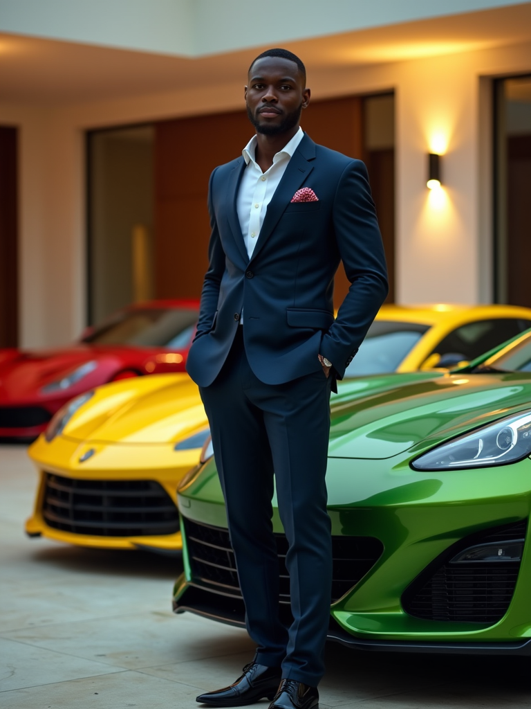 Full-body shot of of model standing next to a luxury car, wearing a sophisticated navy blazer and tailored trousers. The background features a luxury design villa in Dubai with green, yellow and red sports cars. Vibrant lighting.