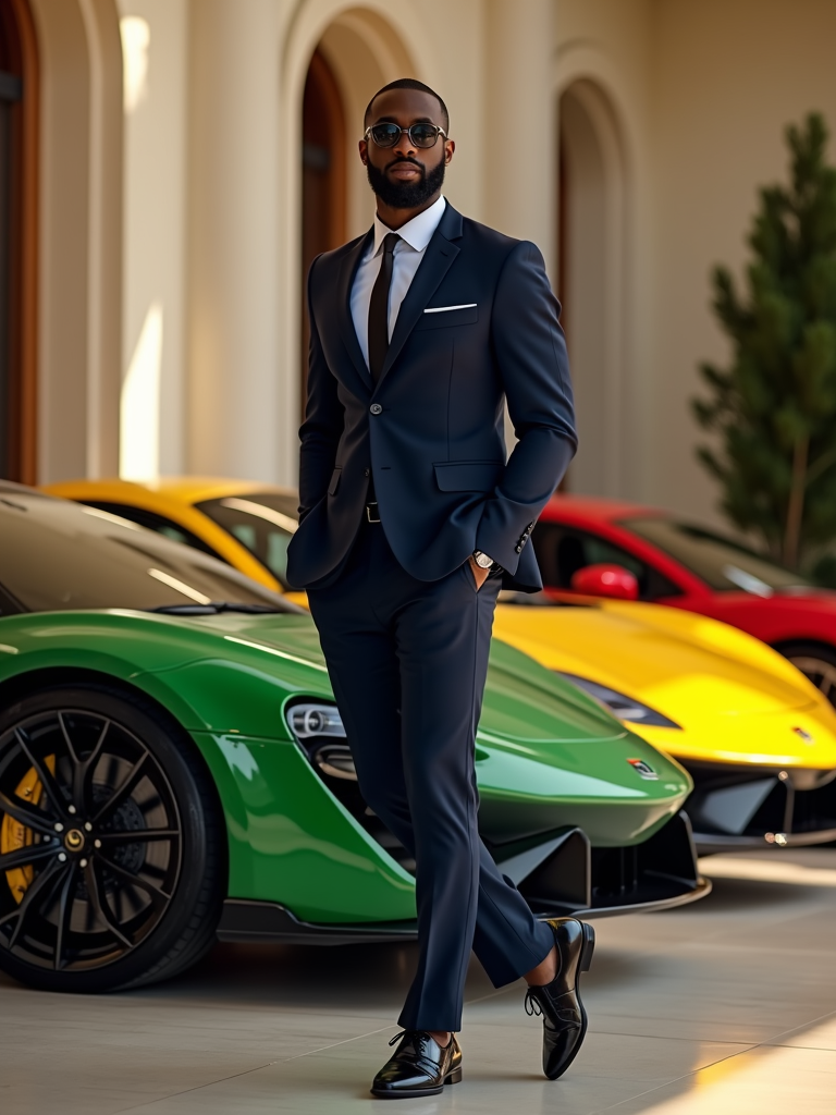 Full-body shot of of model standing next to a luxury car, wearing a sophisticated navy blazer and tailored trousers. The background features a luxury design villa in Dubai with green, yellow and red sports cars. Vibrant lighting.