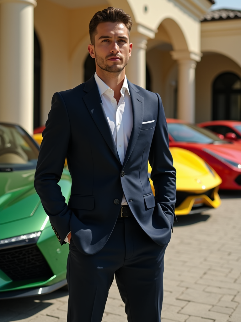 Full-body shot of of model standing next to a luxury car, wearing a sophisticated navy blazer and tailored trousers. The background features a luxury design villa in Dubai with green, yellow and red sports cars. Vibrant lighting.