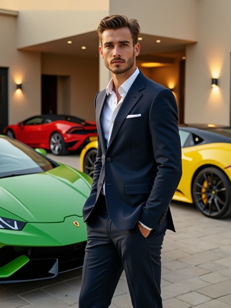 Full-body shot of of model standing next to a luxury car, wearing a sophisticated navy blazer and tailored trousers. The background features a luxury design villa in Dubai with green, yellow and red sports cars. Vibrant lighting.