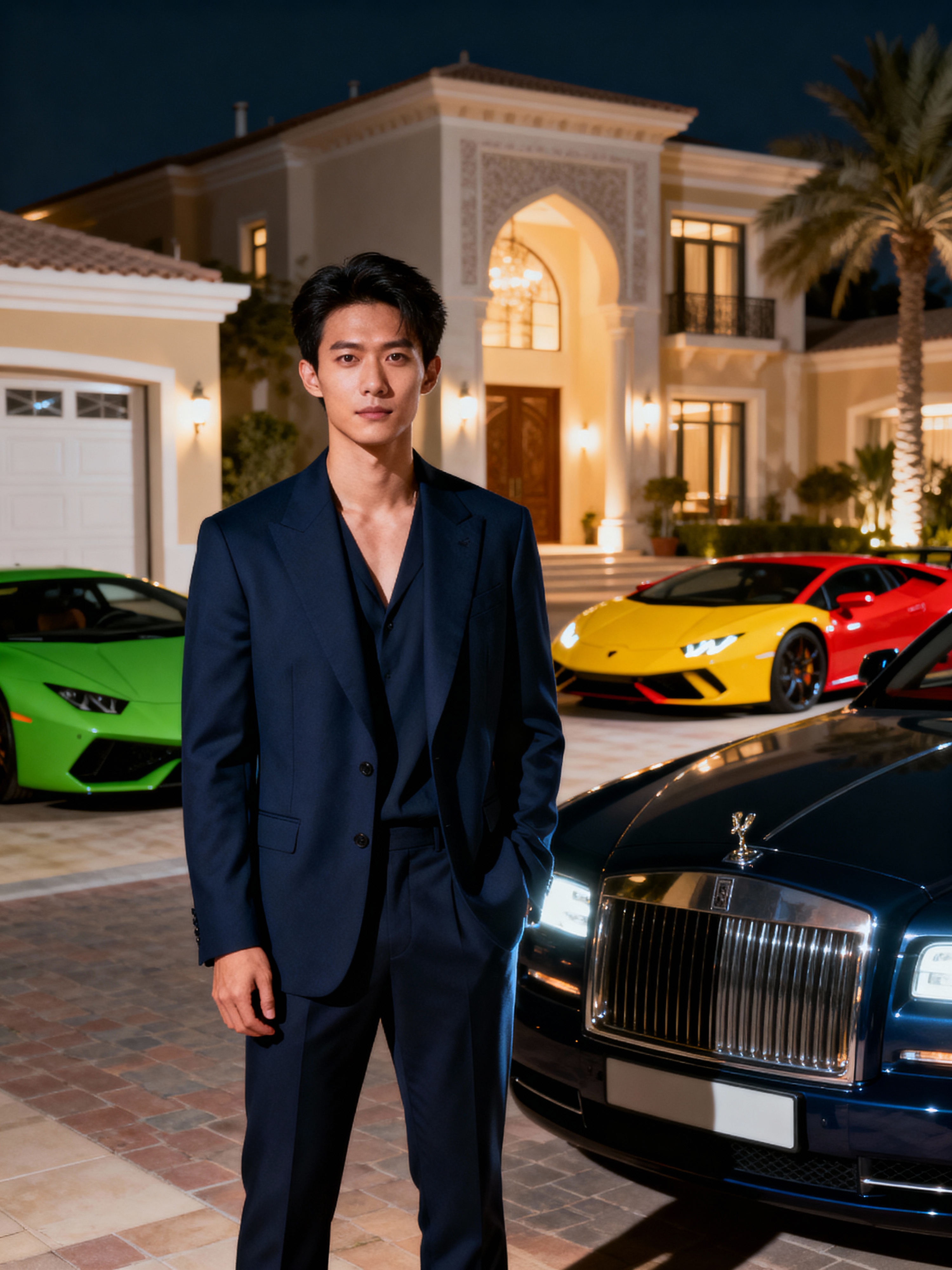 Full-body shot of of model standing next to a luxury car, wearing a sophisticated navy blazer and tailored trousers. The background features a luxury design villa in Dubai with green, yellow and red sports cars. Vibrant lighting.