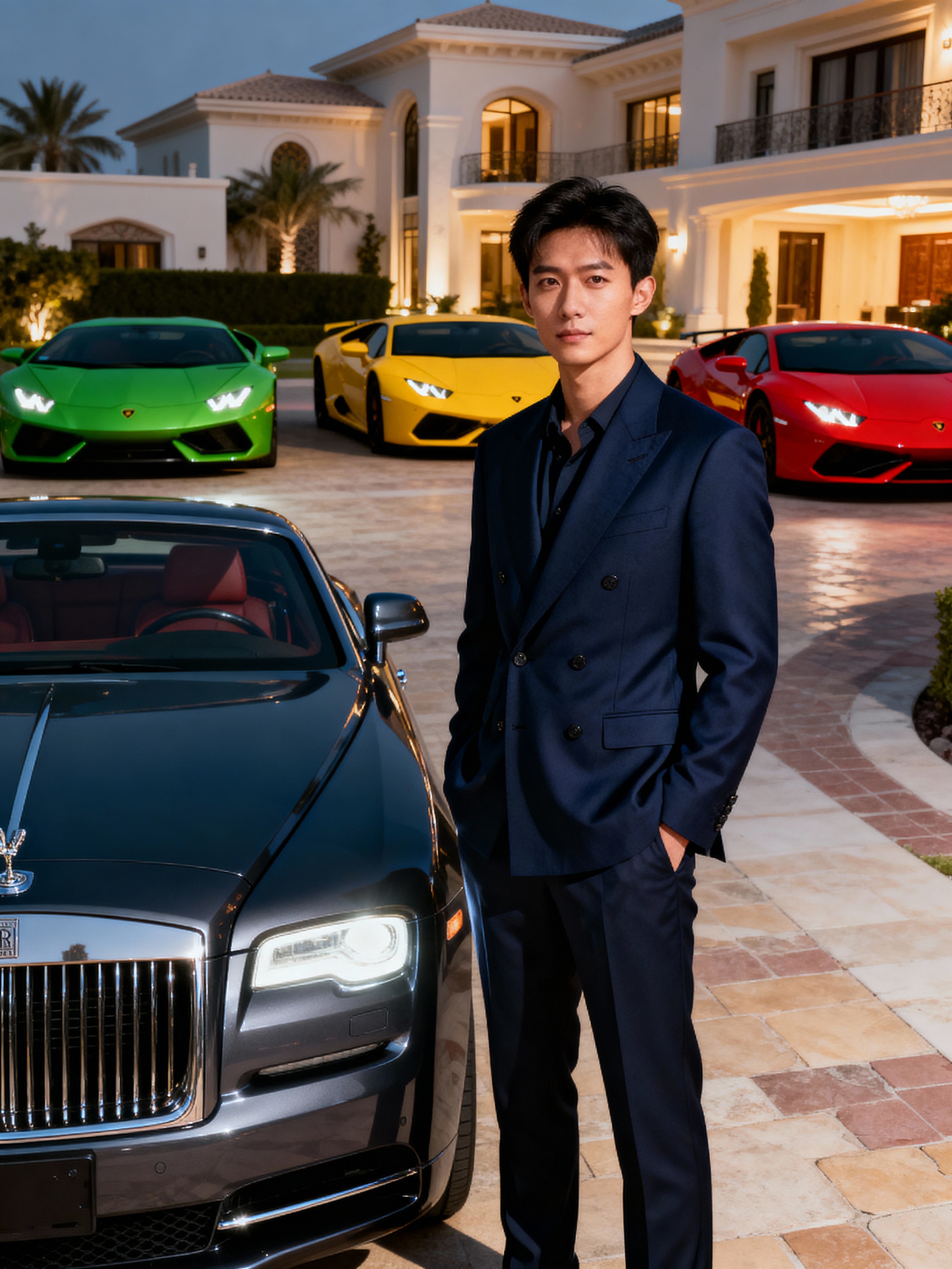 Full-body shot of of model standing next to a luxury car, wearing a sophisticated navy blazer and tailored trousers. The background features a luxury design villa in Dubai with green, yellow and red sports cars. Vibrant lighting.