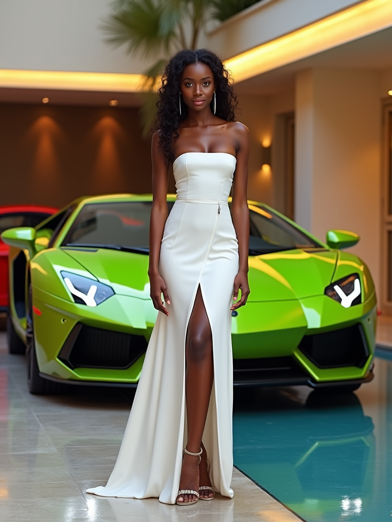 Full-body shot of of model standing next to a luxury car, wearing an elegant white cocktail dress with high heels . The background features a luxury design villa in Dubai with green, yellow and red sports cars. Vibrant lighting.