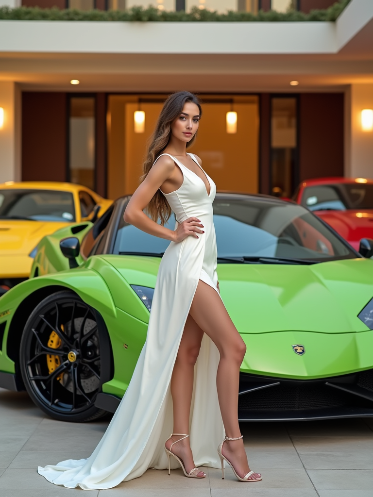 Full-body shot of of model standing next to a luxury car, wearing an elegant white cocktail dress with high heels . The background features a luxury design villa in Dubai with green, yellow and red sports cars. Vibrant lighting.