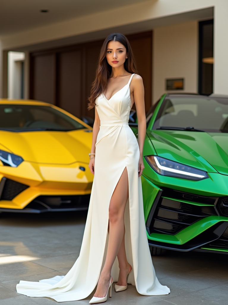 Full-body shot of of model standing next to a luxury car, wearing an elegant white cocktail dress with high heels . The background features a luxury design villa in Dubai with green, yellow and red sports cars. Vibrant lighting.