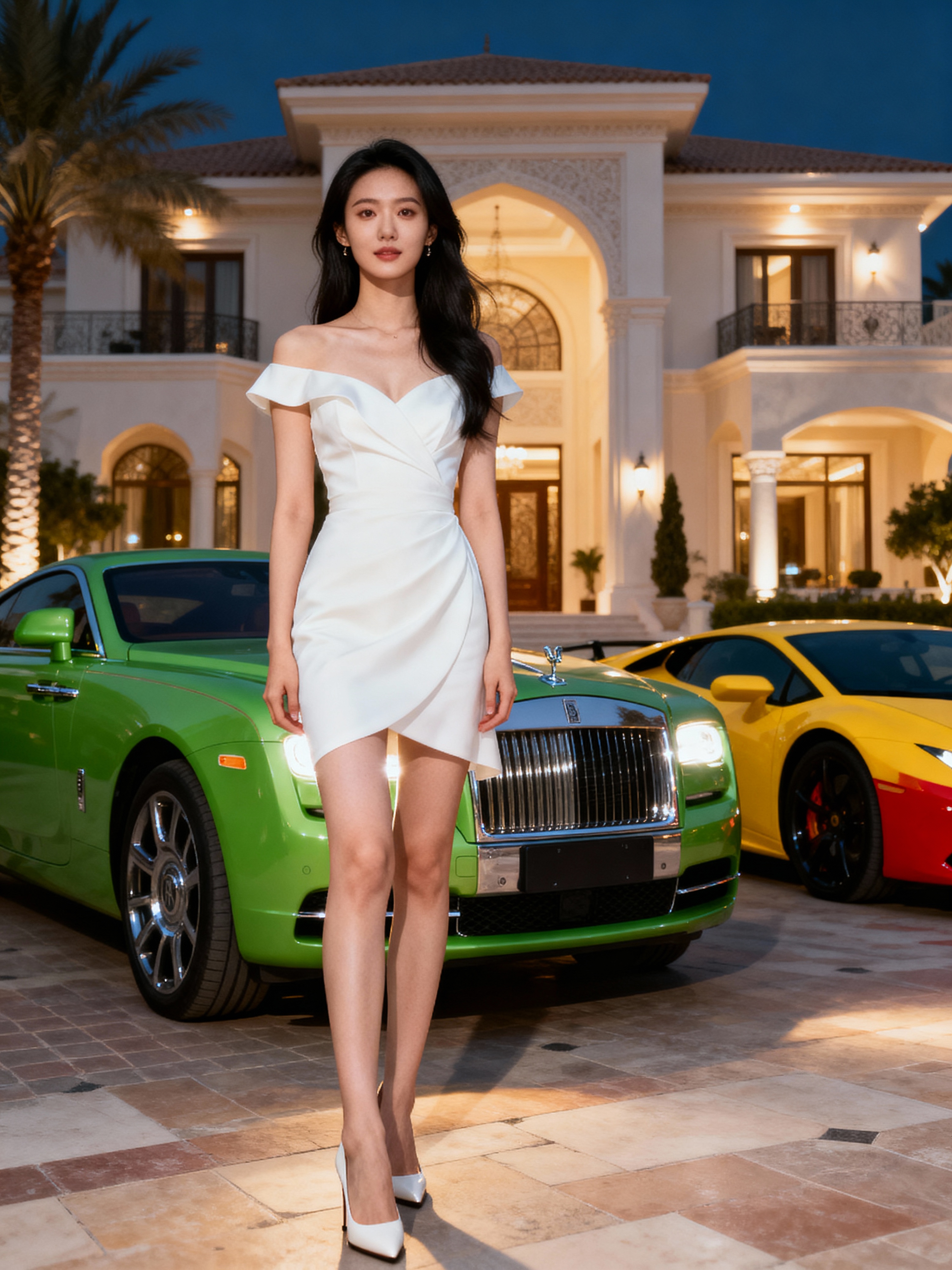 Full-body shot of of model standing next to a luxury car, wearing an elegant white cocktail dress with high heels . The background features a luxury design villa in Dubai with green, yellow and red sports cars. Vibrant lighting.