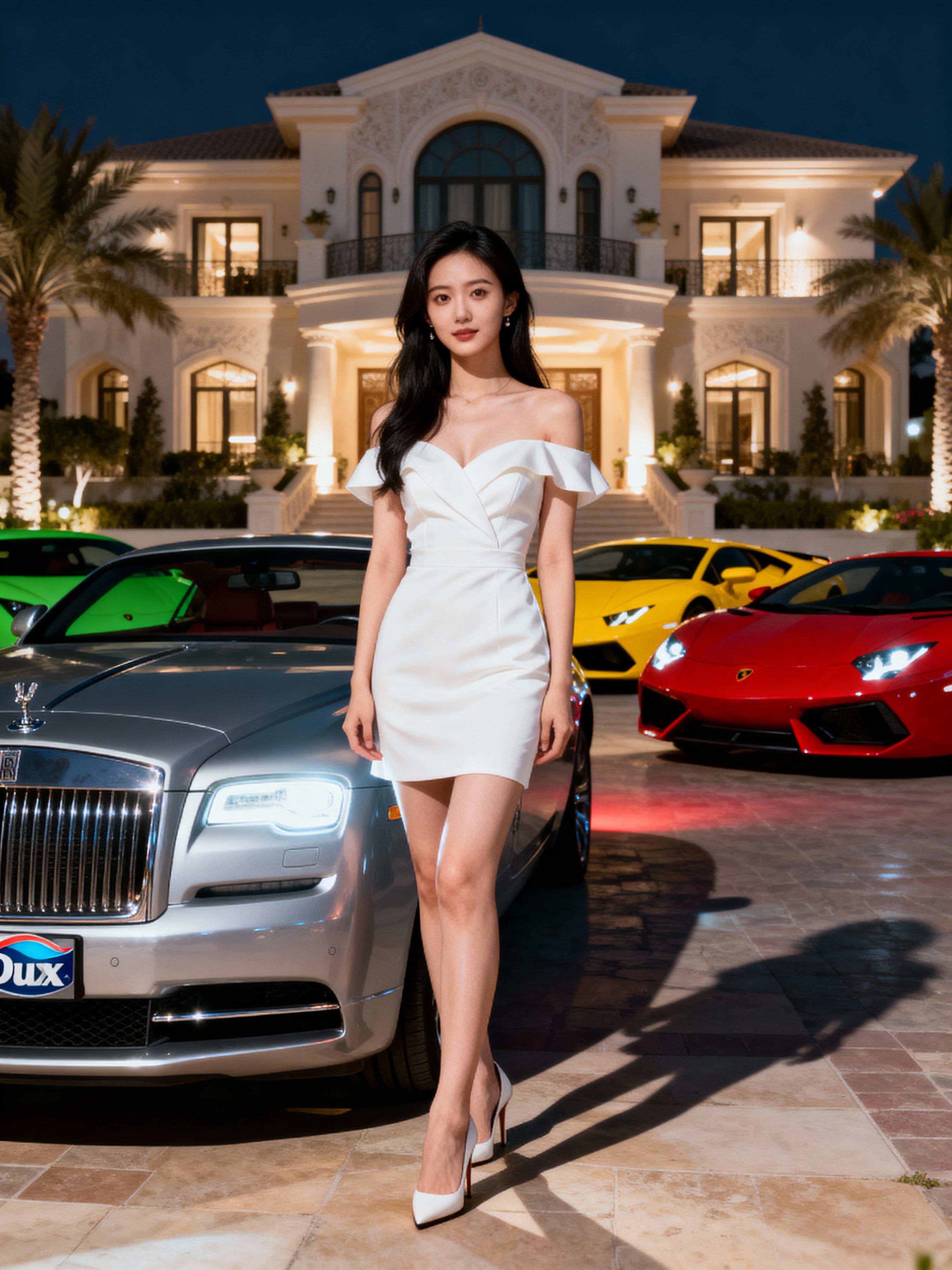 Full-body shot of of model standing next to a luxury car, wearing an elegant white cocktail dress with high heels . The background features a luxury design villa in Dubai with green, yellow and red sports cars. Vibrant lighting.