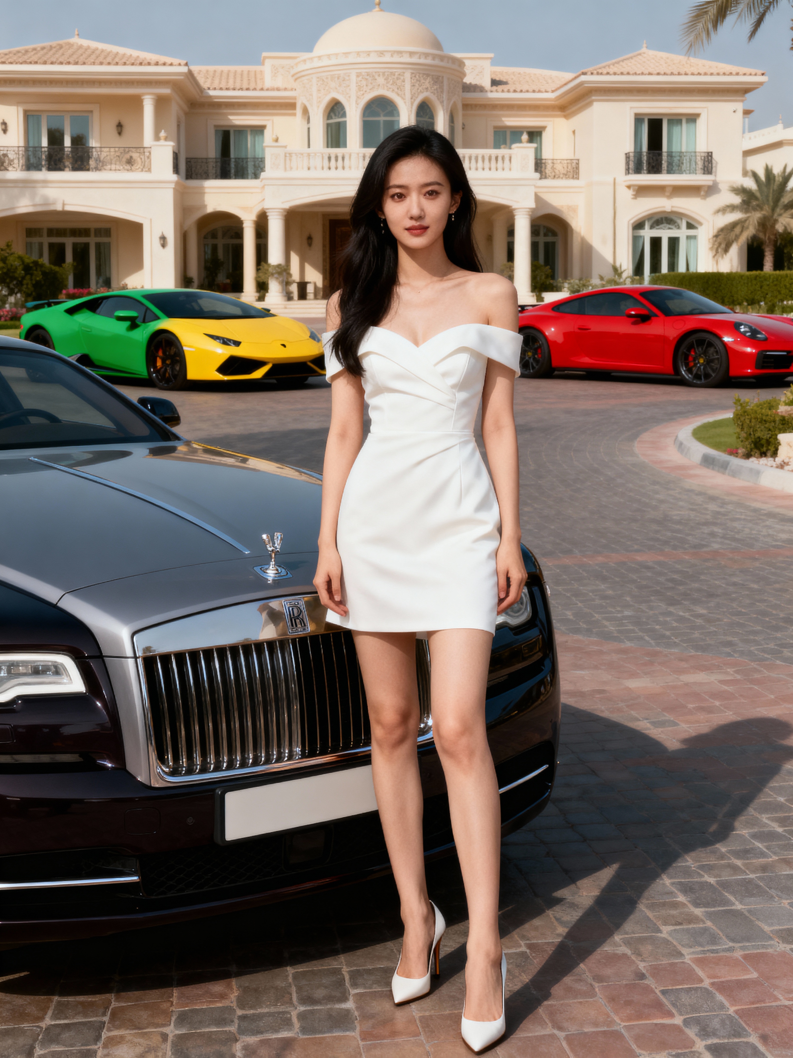Full-body shot of of model standing next to a luxury car, wearing an elegant white cocktail dress with high heels . The background features a luxury design villa in Dubai with green, yellow and red sports cars. Vibrant lighting.