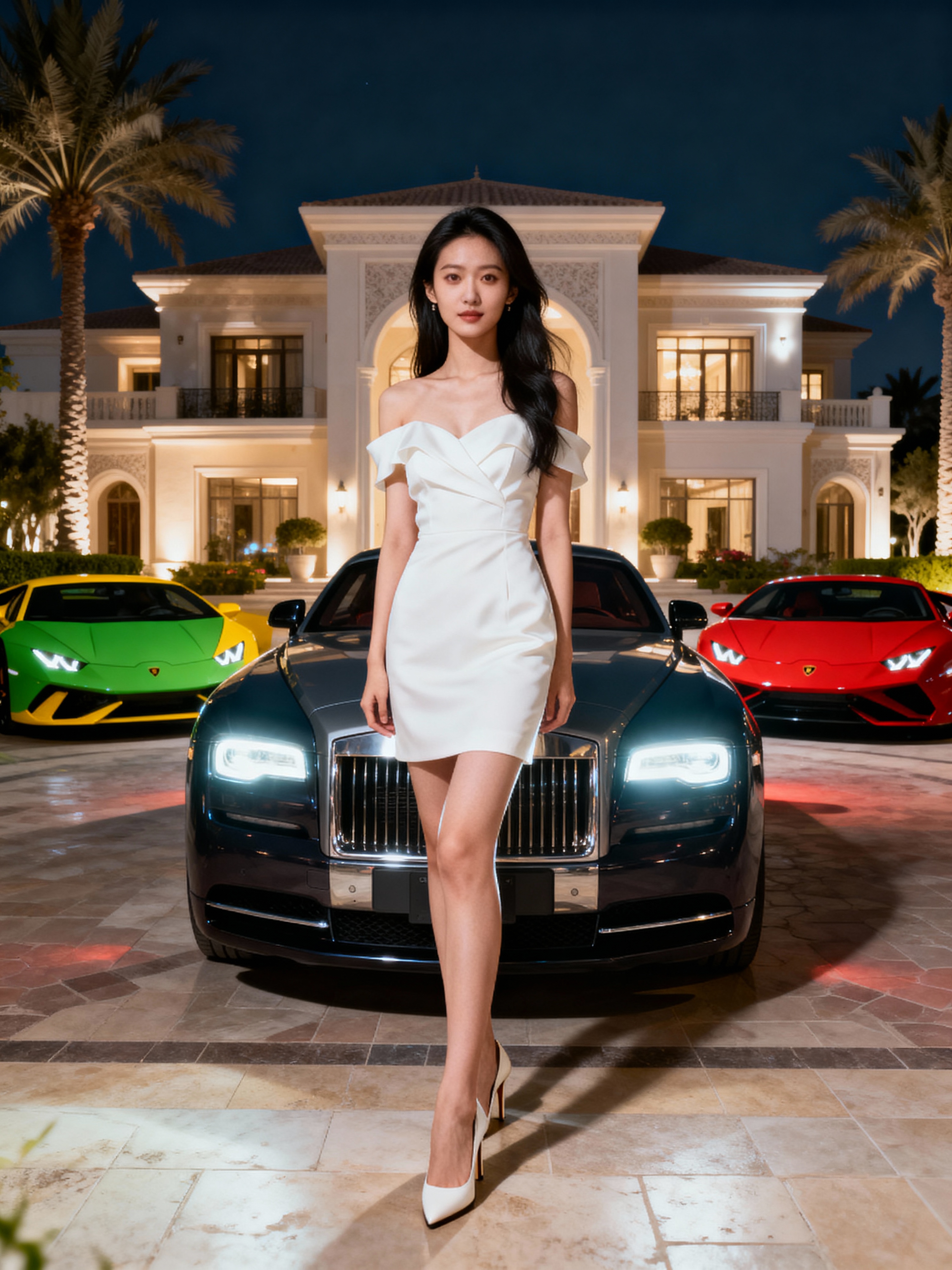 Full-body shot of of model standing next to a luxury car, wearing an elegant white cocktail dress with high heels . The background features a luxury design villa in Dubai with green, yellow and red sports cars. Vibrant lighting.