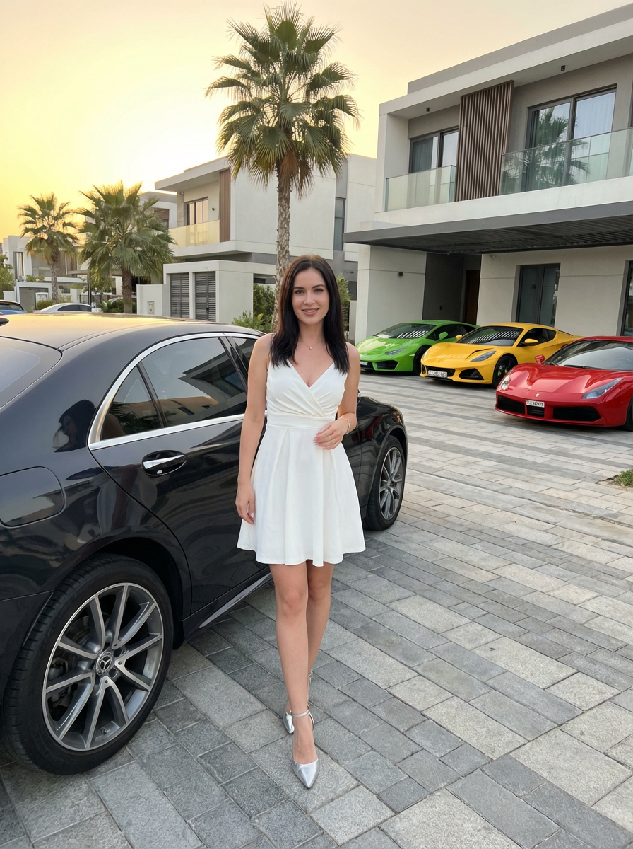 Full-body shot of of model standing next to a luxury car, wearing an elegant white cocktail dress with high heels . The background features a luxury design villa in Dubai with green, yellow and red sports cars. Vibrant lighting.