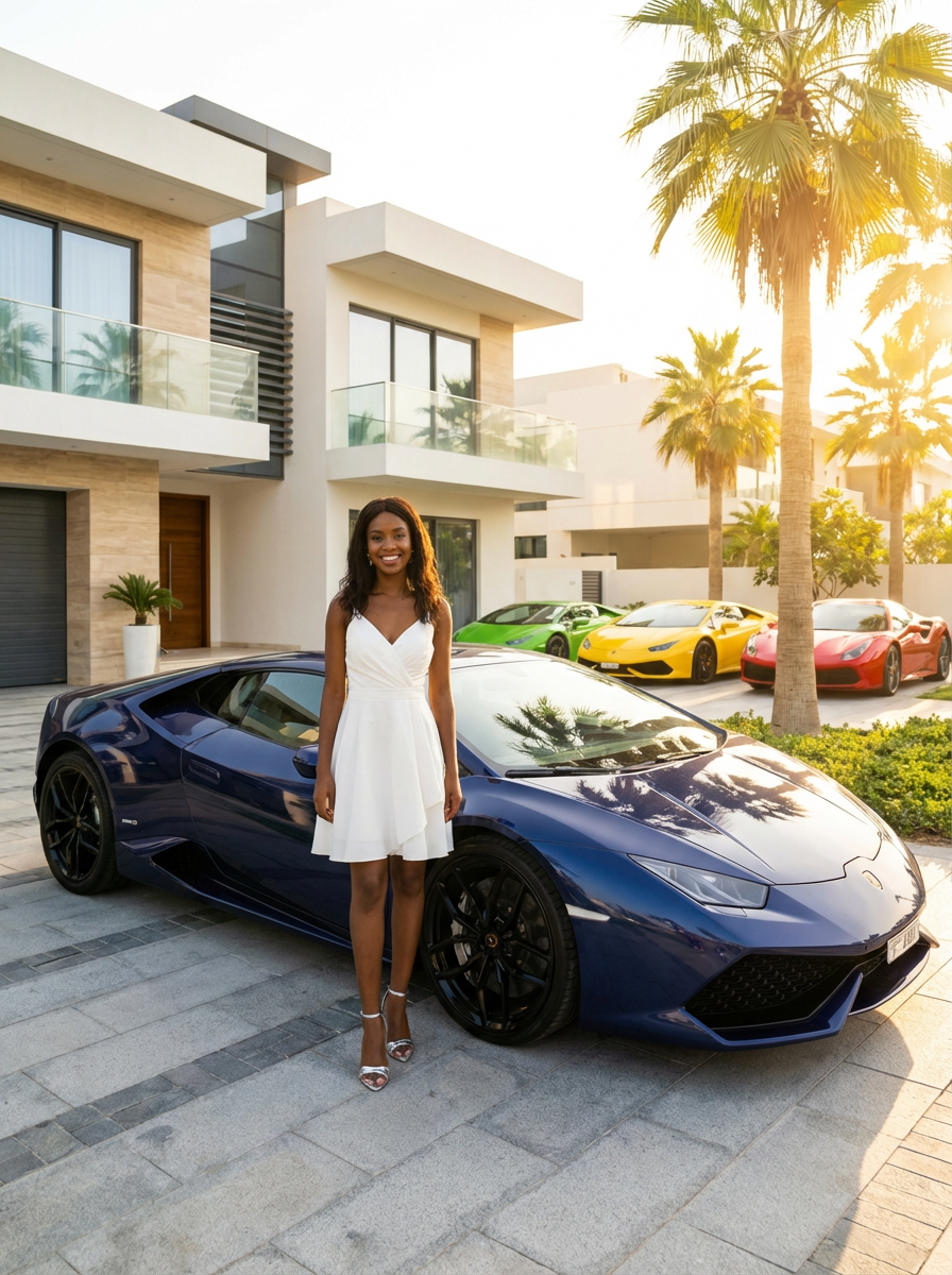 Full-body shot of of model standing next to a luxury car, wearing an elegant white cocktail dress with high heels . The background features a luxury design villa in Dubai with green, yellow and red sports cars. Vibrant lighting.