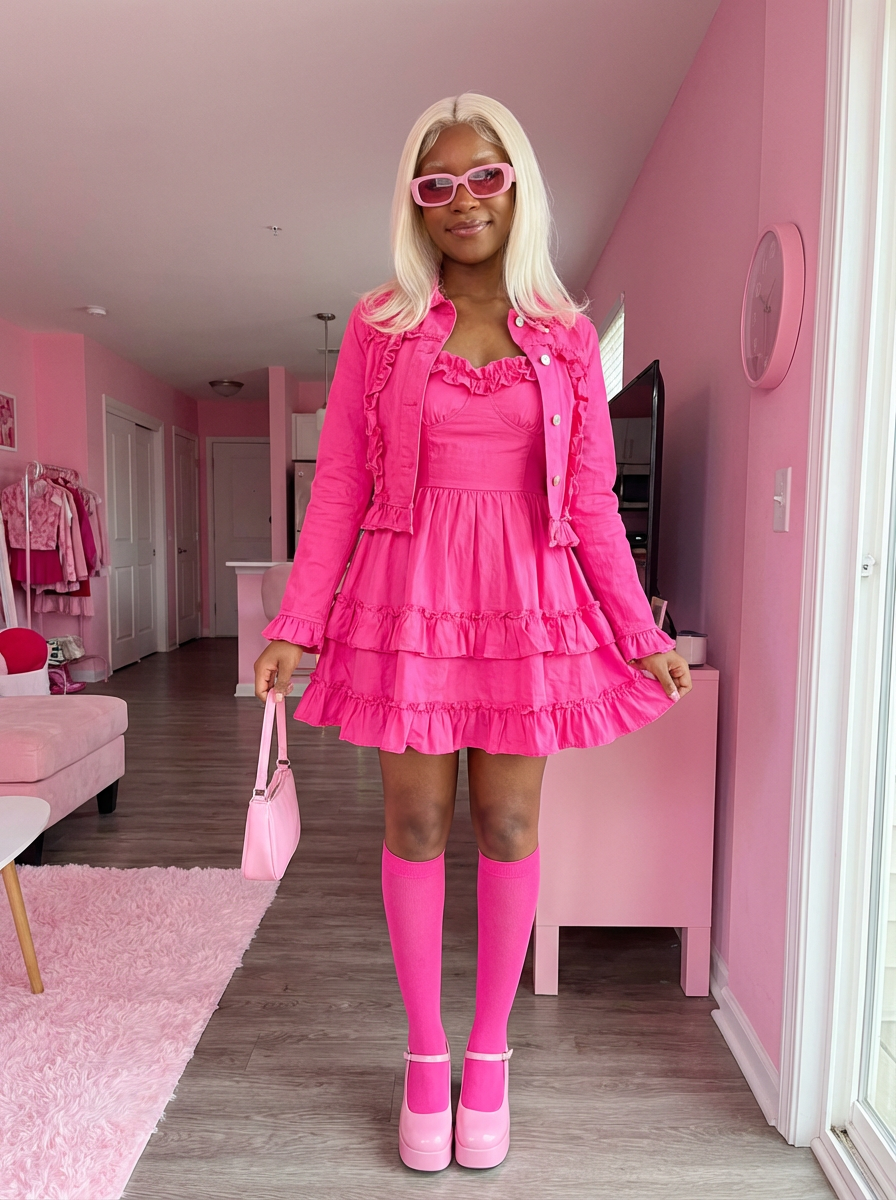 full body shot of sexy model dressed up in full hot pink with pink doll clothes platinum blonde hair, hot pink style