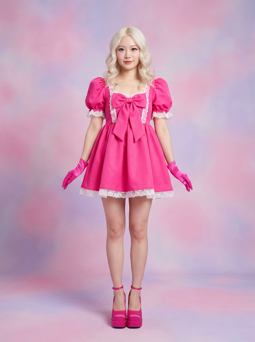 full body shot of sexy model dressed up in full hot pink with pink doll clothes platinum blonde hair, hot pink style