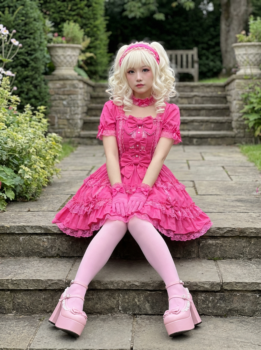 full body shot of sexy model dressed up in full hot pink with pink doll clothes platinum blonde hair, hot pink style