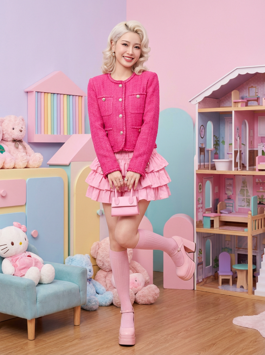 full body shot of sexy model dressed up in full hot pink with pink doll clothes platinum blonde hair, hot pink style