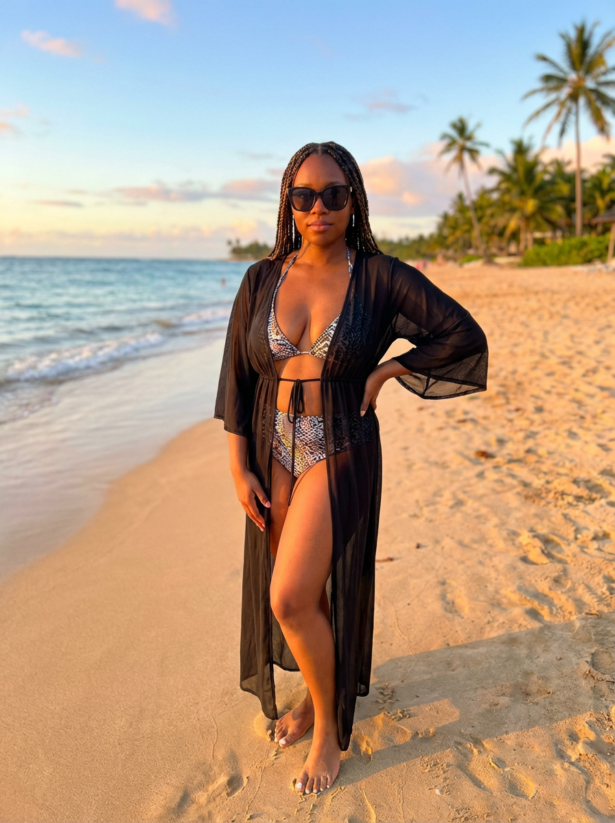 (full-body shot) of model in a sultry beachwear ensemble , posed against a vibrant beach setting