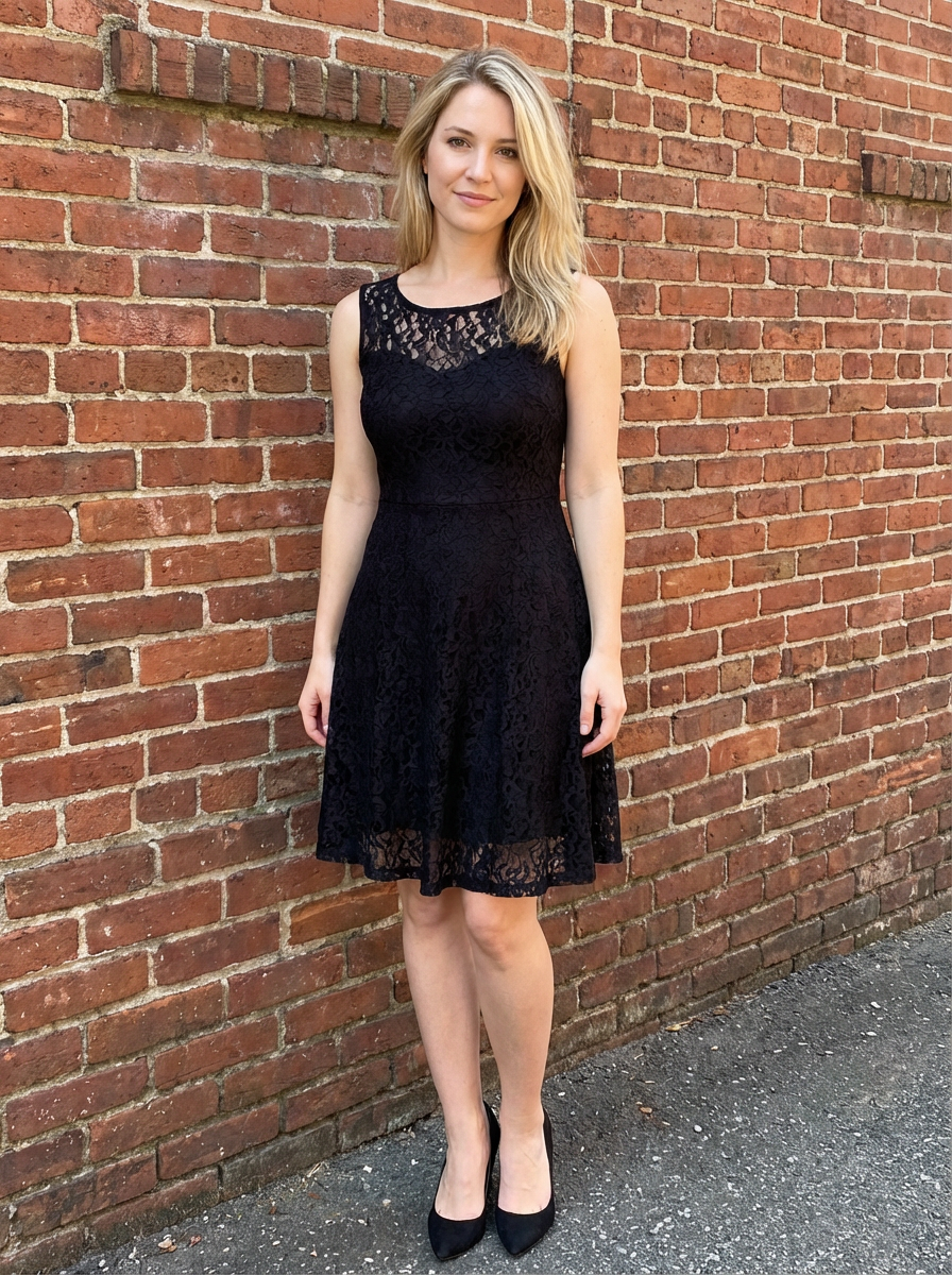 (full-body shot) of model in bold, fitted dress against a classic brick wall background