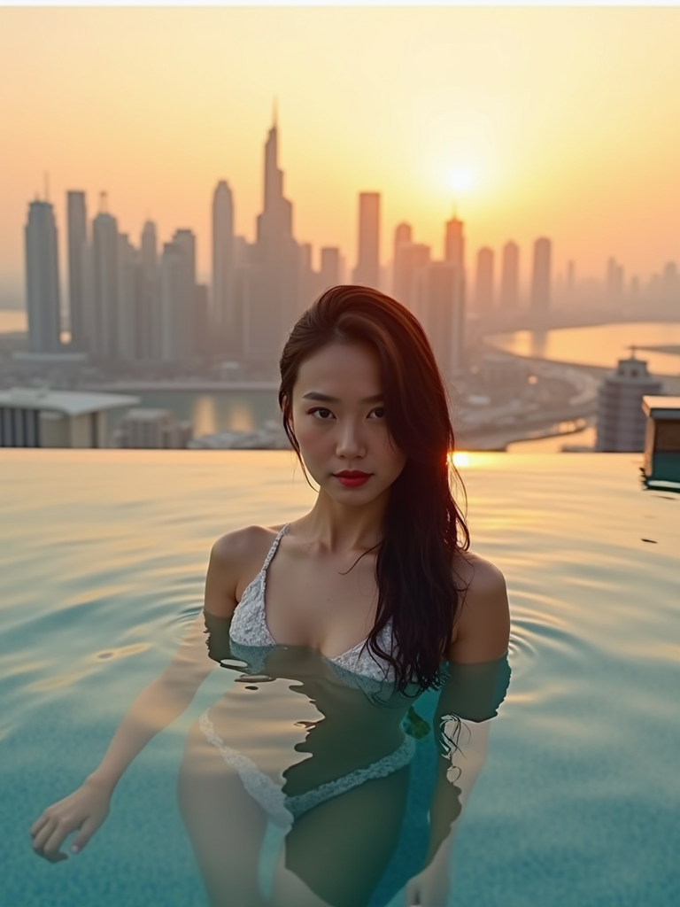 Full-body shot of model in infinity pool overlooking the skyline of Dubai at golden hour sunset. Model looks into the camera. upper body is outside the water.