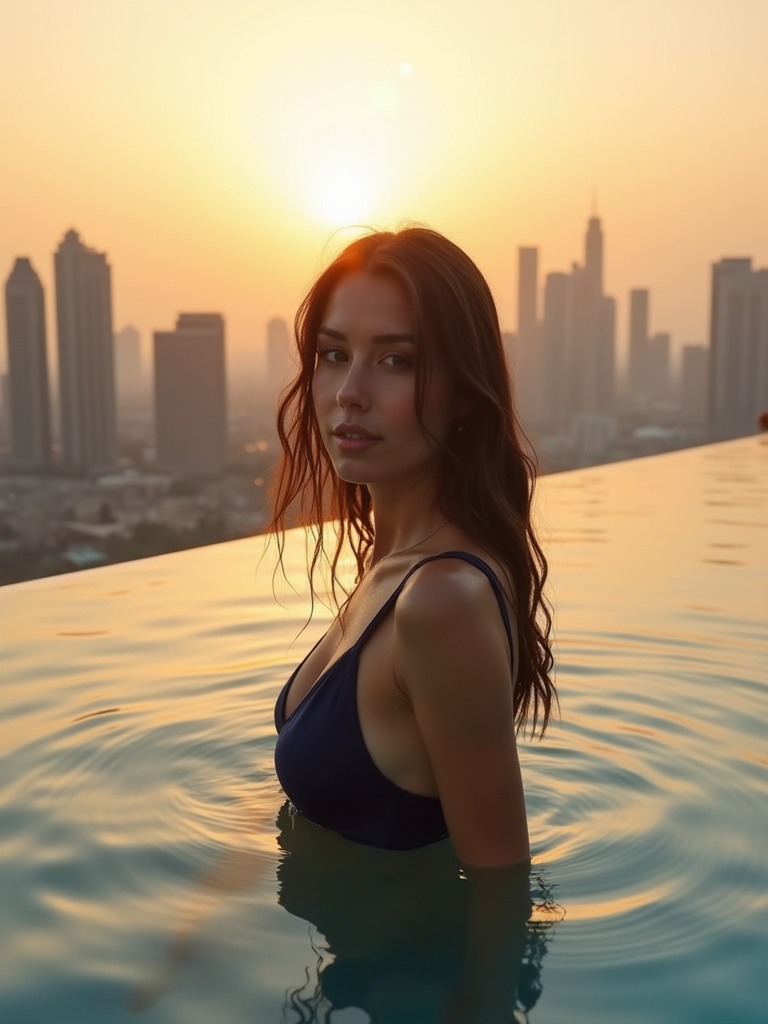 Full-body shot of model in infinity pool overlooking the skyline of Dubai at golden hour sunset. Model looks into the camera. upper body is outside the water.