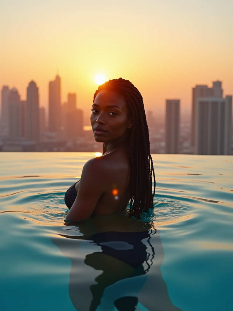 Full-body shot of model in infinity pool overlooking the skyline of Dubai at golden hour sunset. Model looks into the camera. upper body is outside the water.