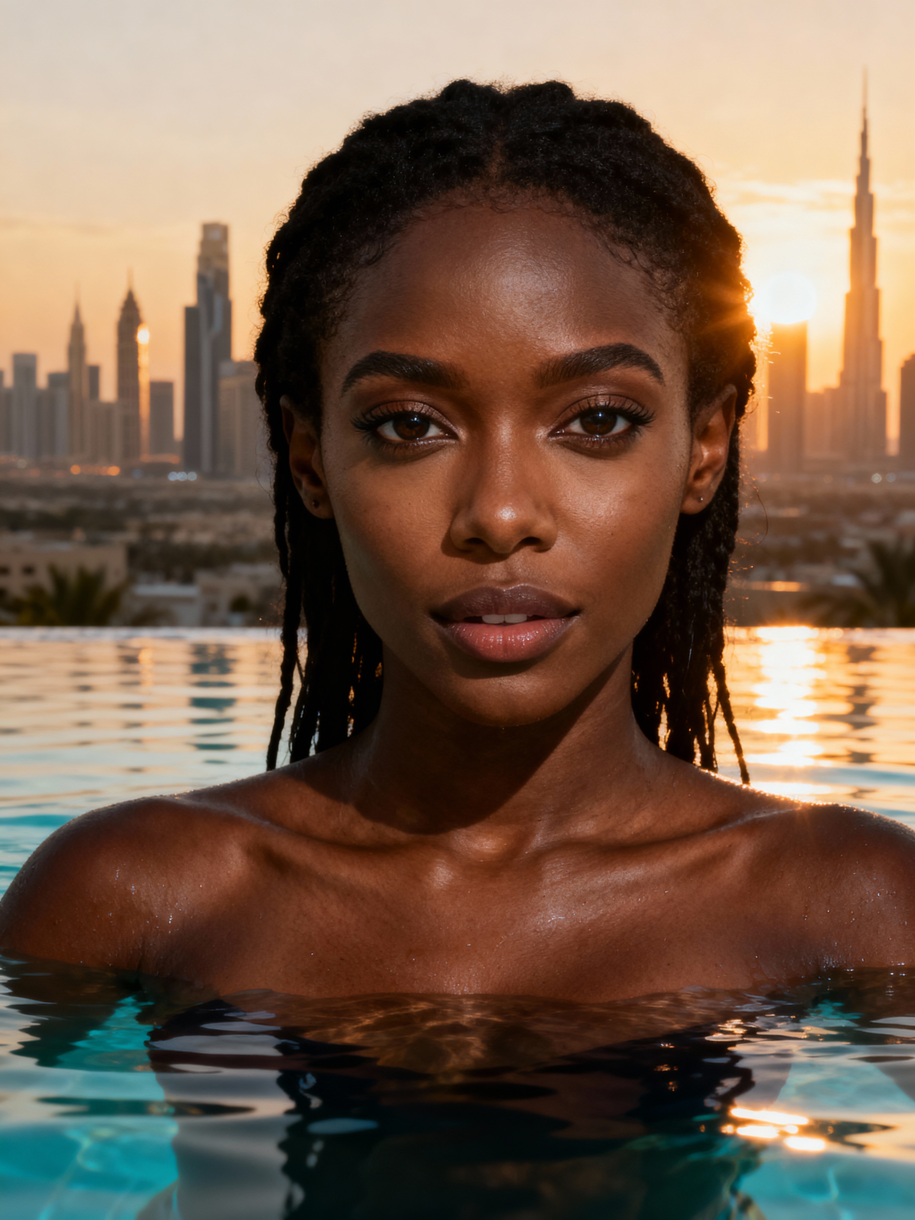 Full-body shot of model in infinity pool overlooking the skyline of Dubai at golden hour sunset. Model looks into the camera. upper body is outside the water.