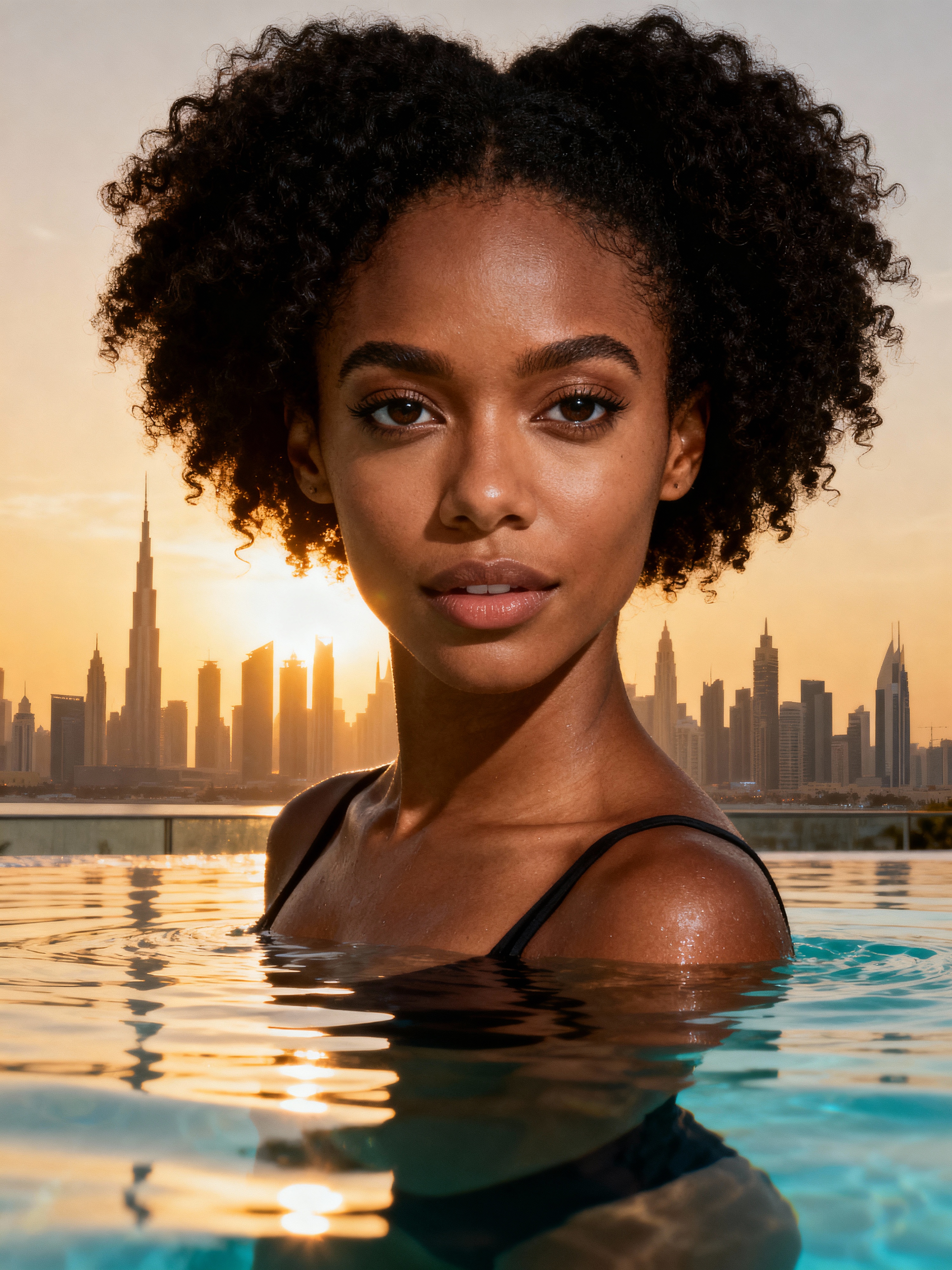 Full-body shot of model in infinity pool overlooking the skyline of Dubai at golden hour sunset. Model looks into the camera. upper body is outside the water.