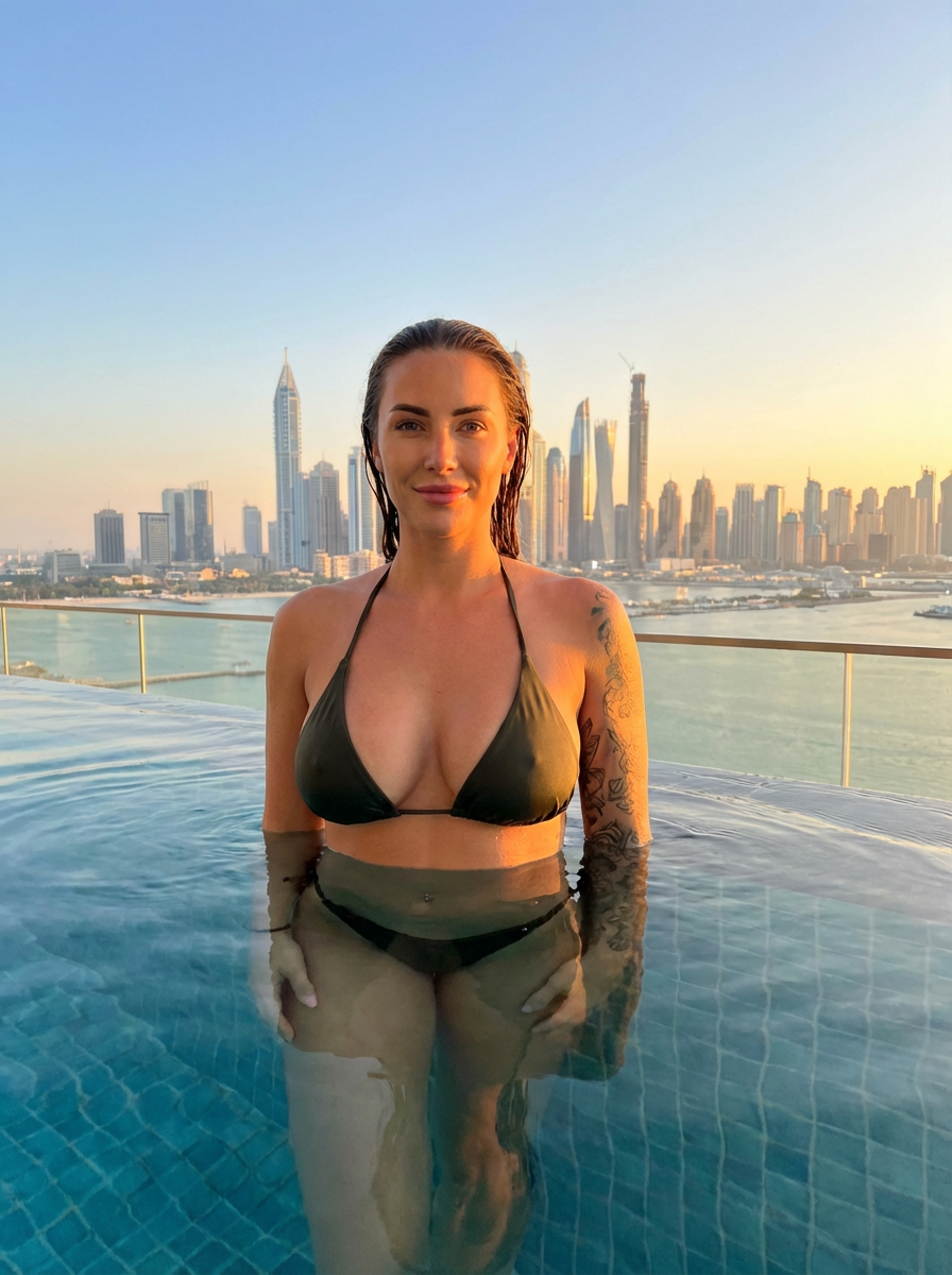 Full-body shot of model in infinity pool overlooking the skyline of Dubai at golden hour sunset. Model looks into the camera. upper body is outside the water.
