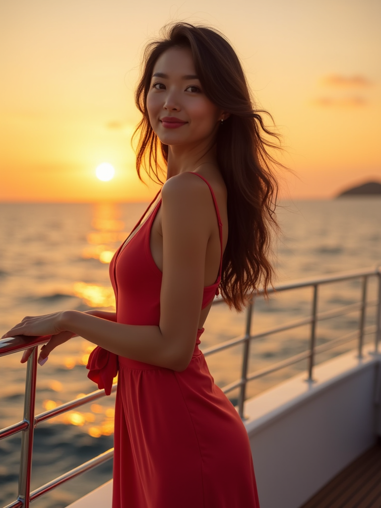 Full-body shot of model posing confidently, on a private yacht with the sunset in the background. Golden hour lighting.
